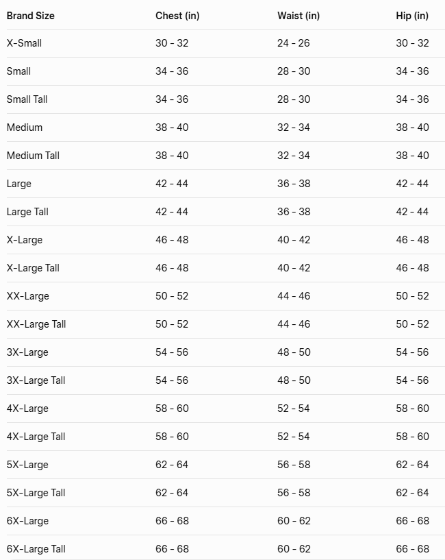 Note: If your measurement falls between sizes, buy the larger size. Units are expressed in inches and reflect general body dimensions. Measurements are approximate.